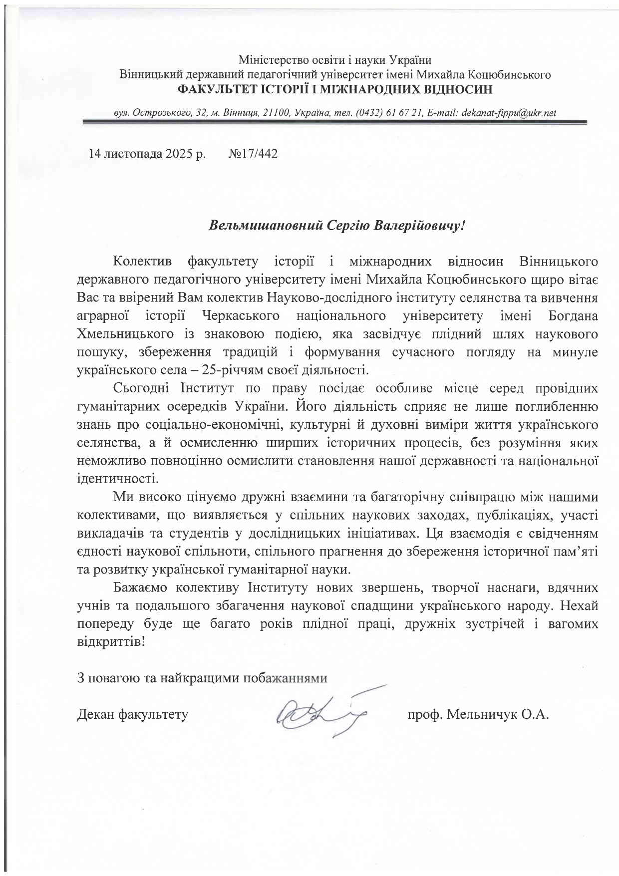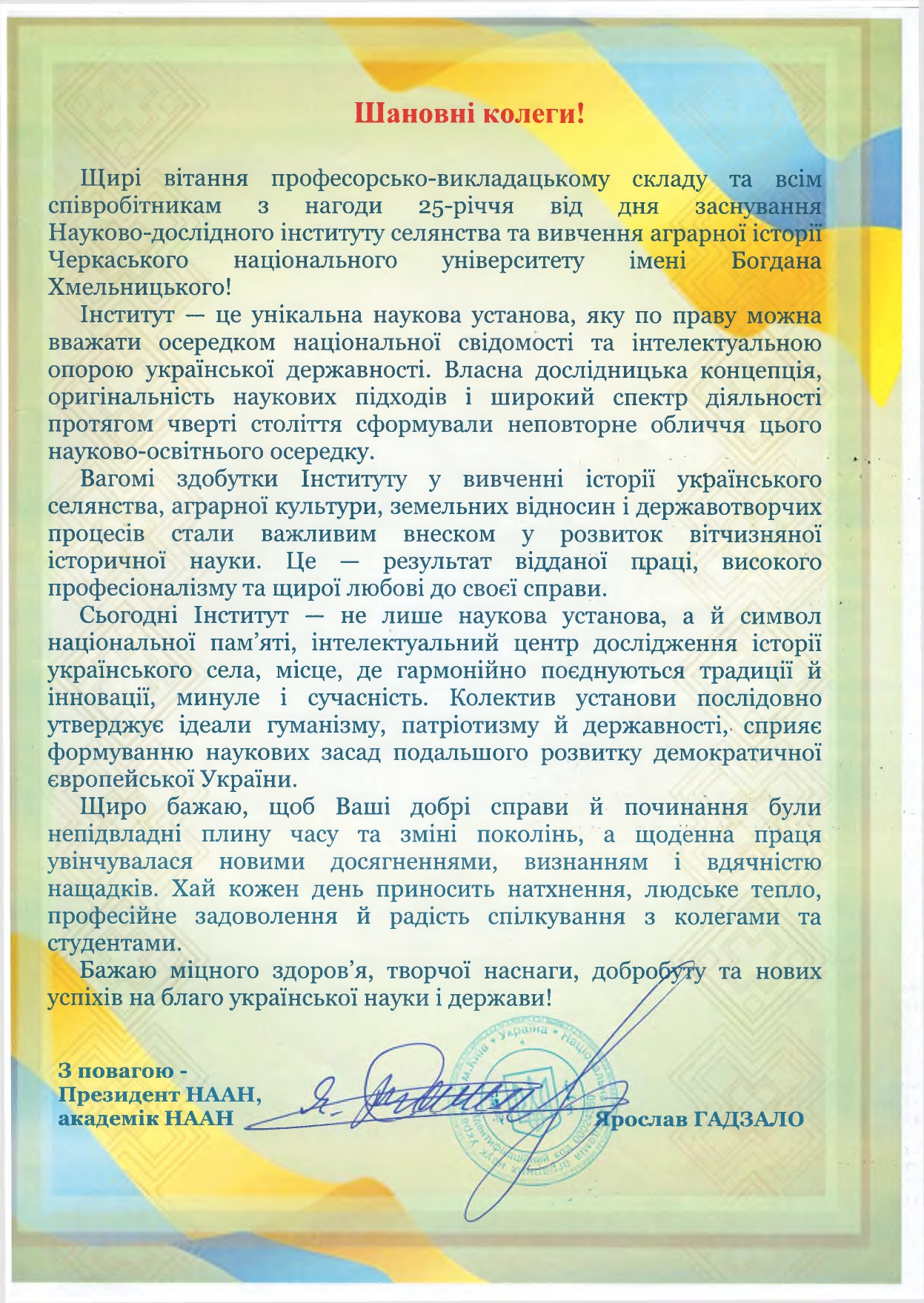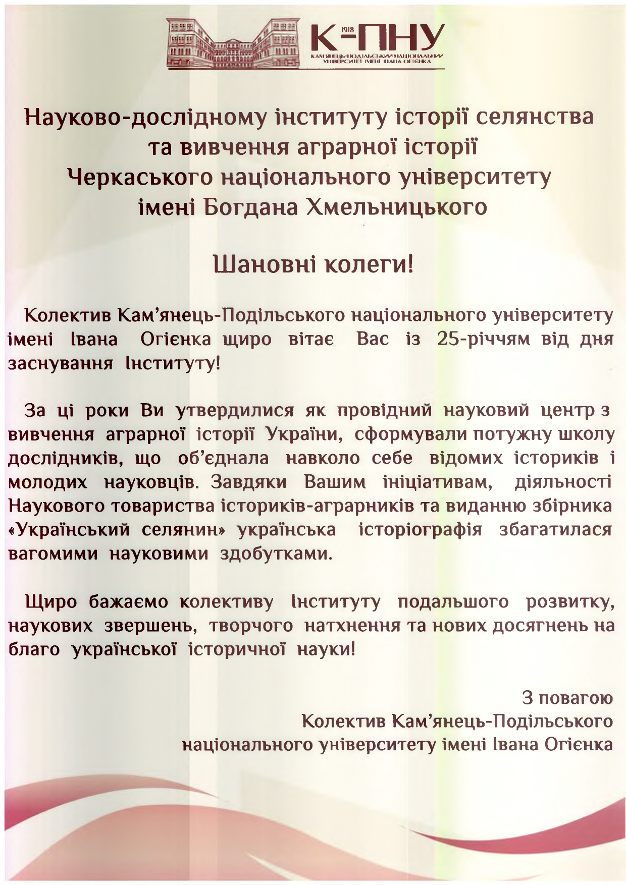 Нуково-дослідний інститут селянства та вивчення аграрної історії висловлює щиру вдячність науковій спільноті за вітання з нагоди 25-річчя.