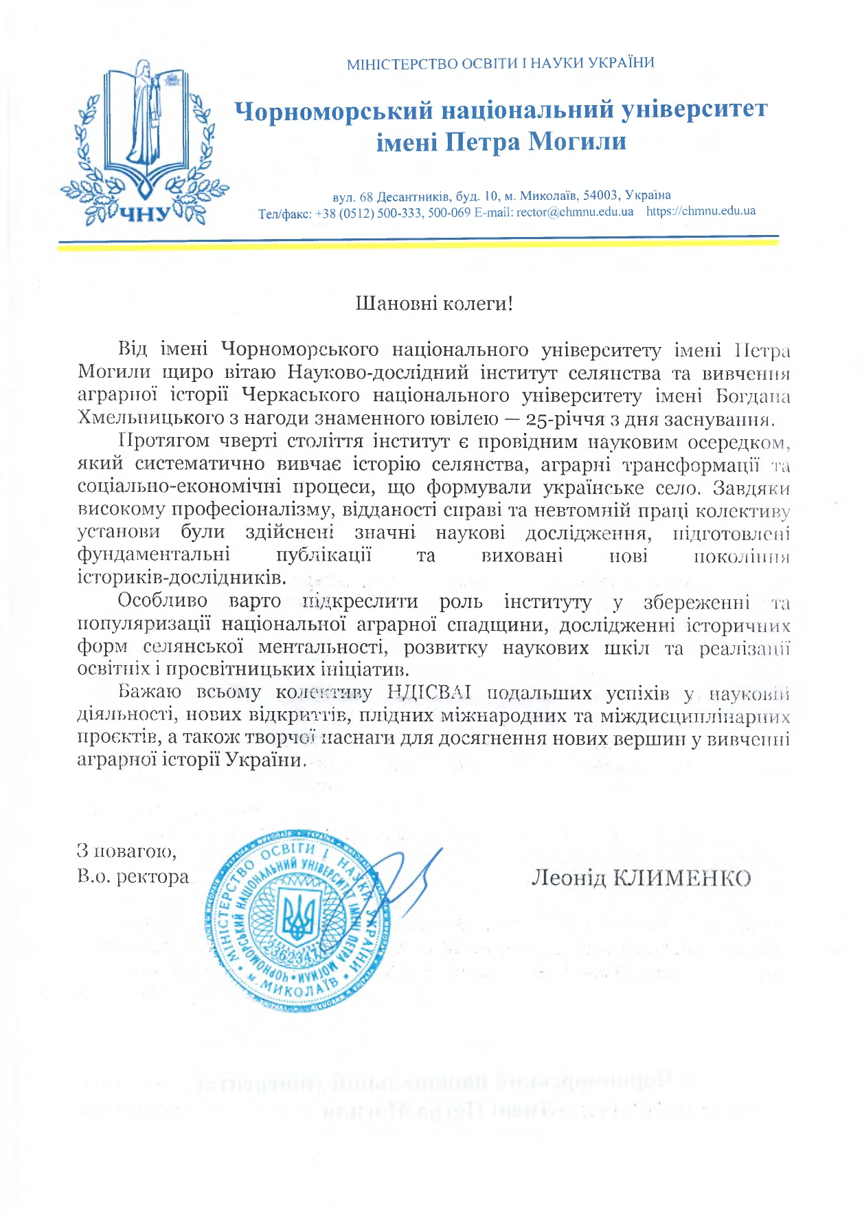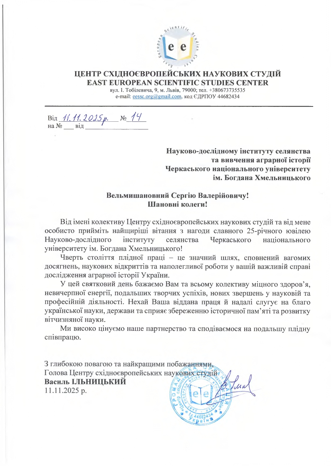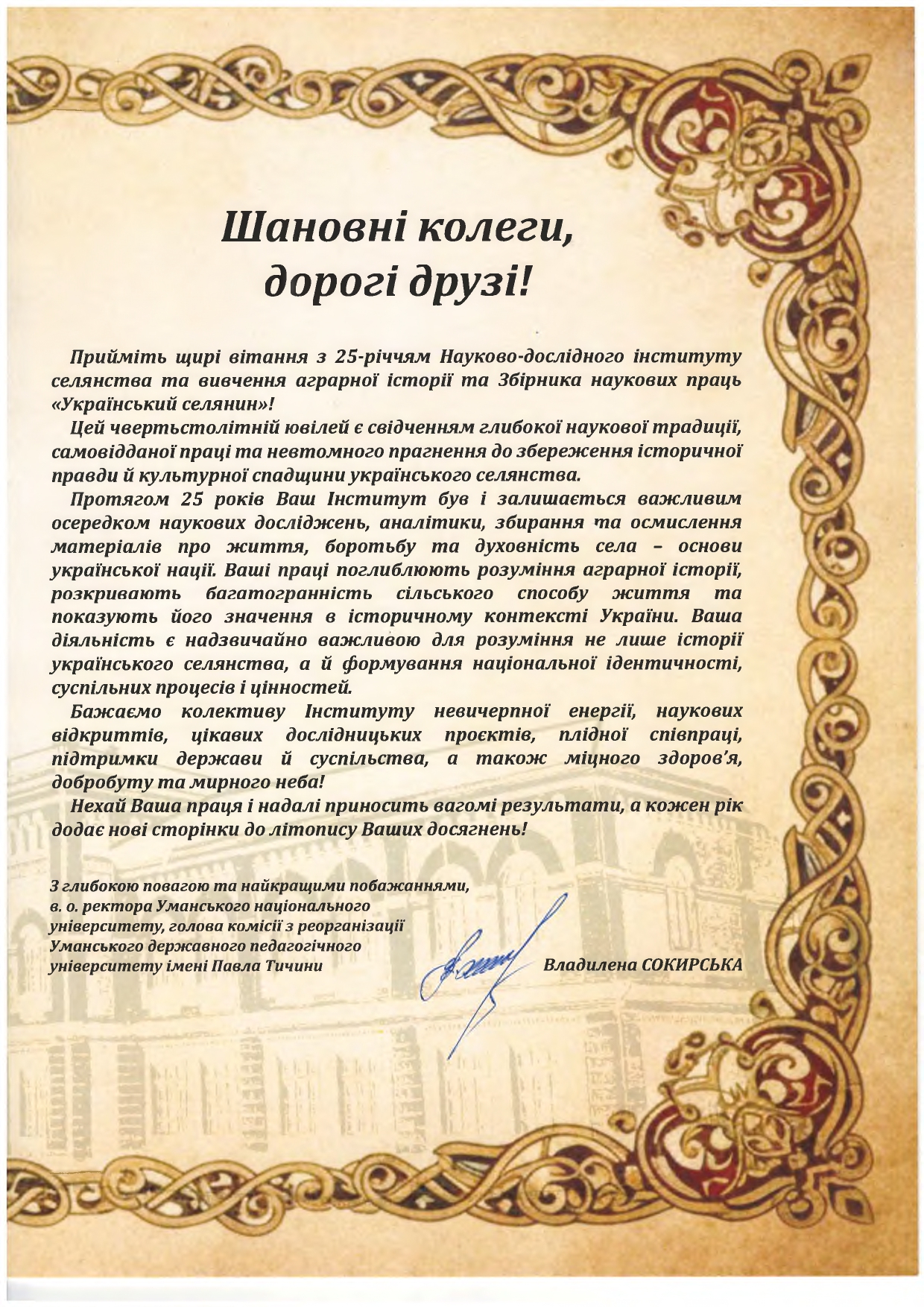 Нуково-дослідний інститут селянства та вивчення аграрної історії висловлює щиру вдячність науковій спільноті за вітання з нагоди 25-річчя.